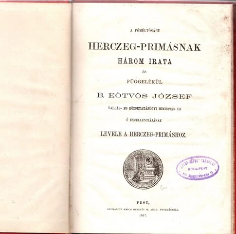 A főméltóságú hercegprímásnak három irata és függelékül B. Eötvös József vallás és közoktatásügyi miniszter őexcellenciájának levele a hercegprímáshoz