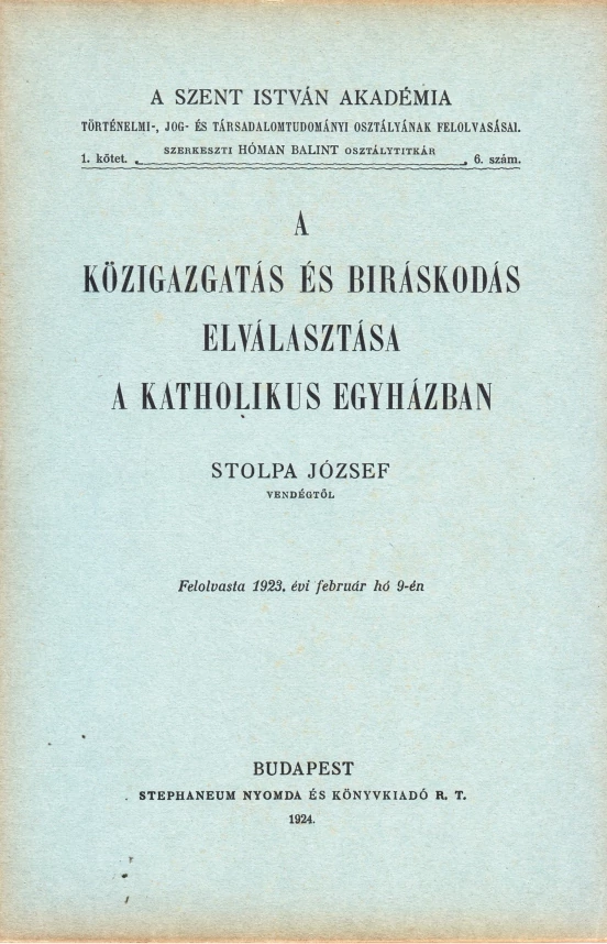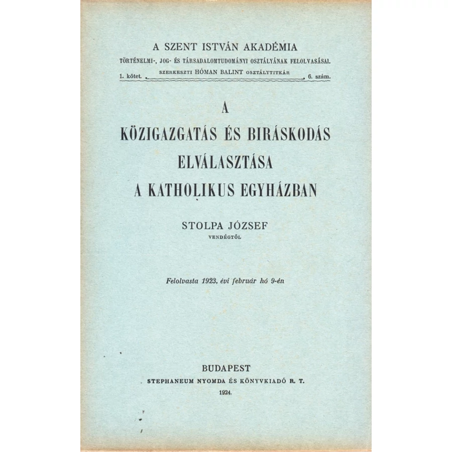 Az egyházi közigazgatás és bíráskodás elválasztása sűrűn visszatérő, bár nem kielégítően méltatott tárgy a háborút közvetlenül megelőző évek egyházjogi irodalmában. Ez az élénk irodalmi érdeklődés a római kúria 1908. évi reformjához kapcsolódott, amelynek során X. Pius elvben kimondott a közigazgatás és bíráskodás elválasztását. Az irodalom nagyrészt elismeréssel és megelégedéssel állapította meg, hogy az egyház a közigazgatás és bíráskodás elválasztásának az államéletben bevált eszméjét a saját szervezetébe is átültette és szívesen sorolta a reformot azok közé a törvényalkotások közé, amelyek az utóbbi évtizedekben az egyházjogot újabb fejlődési irányokba terelik. Kiadói papírkötésben. Kifogástalan állapotú antikvár könyv.