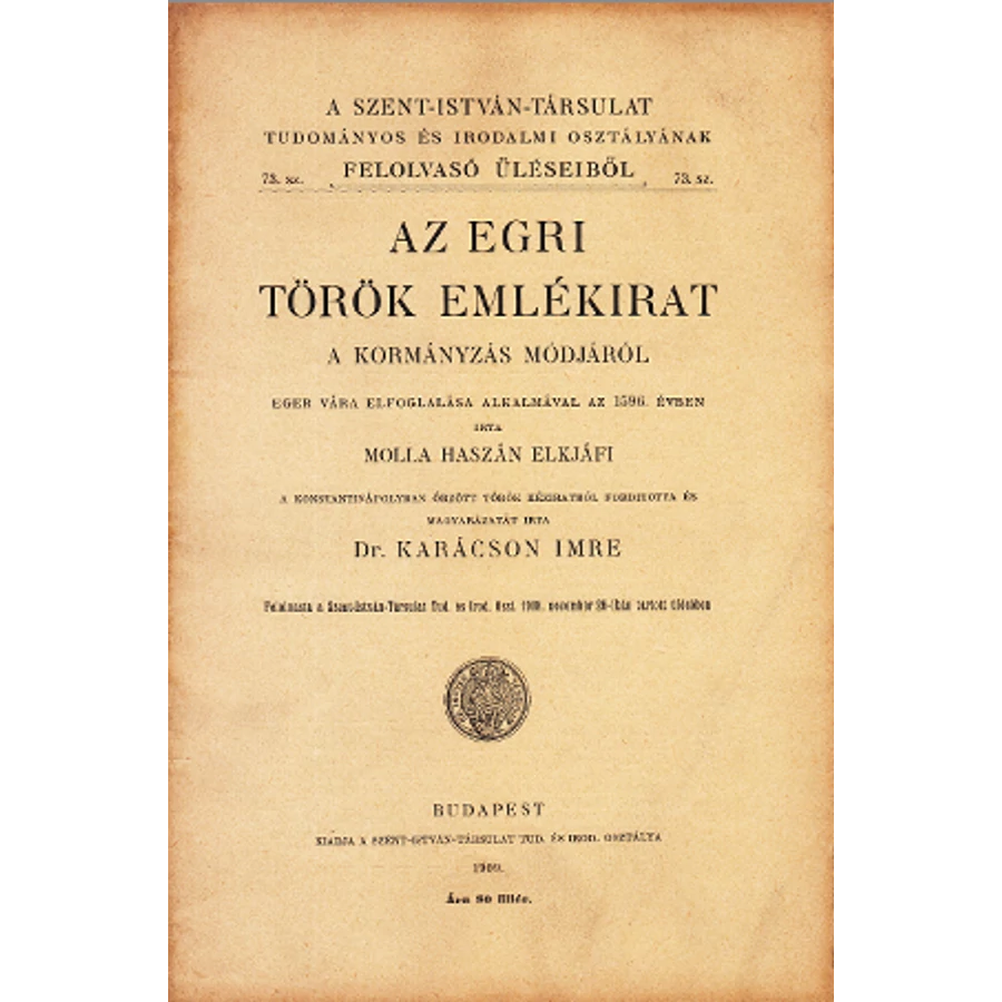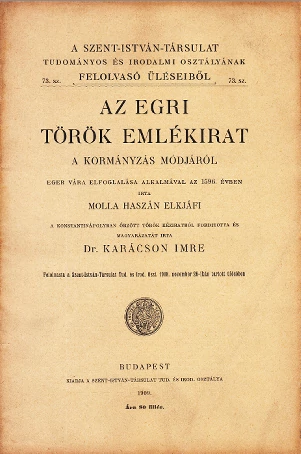 Eger elfoglalása alkalmával az 1596. évben irta Molla Hasszán Elkjáfi. A Konstantinápolyban őrzött török kéziratból fordította és magyarázta Dr. Karácson Imre. Szép állapotú antikvár könyv, vágatlan lapokkal.