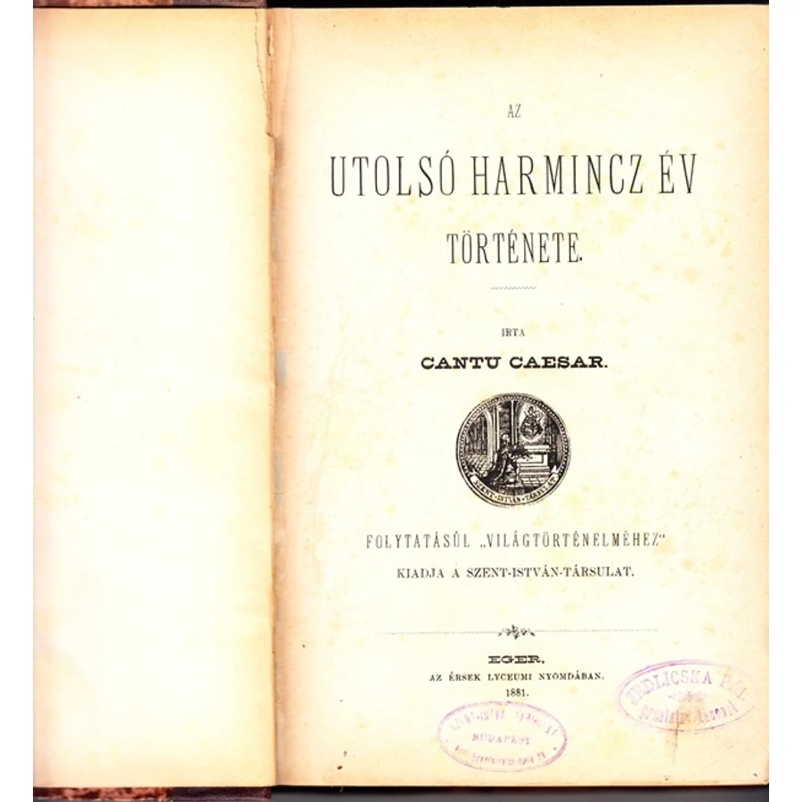 Cesare Cantu olasz történetíró fő műve a Storia universale. Ez a mű magyar kiadásban 15 kötetben jelent meg három pótkötettel kiegészítve. Jelen példány a Folytatásúl a "Világtörténelméhez" c. pótkötet.