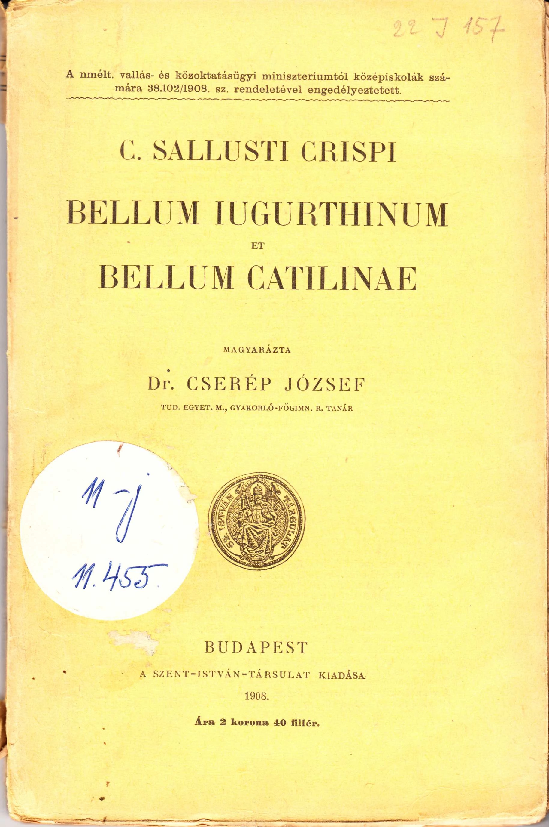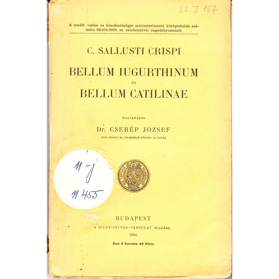 Magyarázta Dr. Cserép József. Sallustius történetírói művészete ebben a két történeti művében tárul elénk. Tacitus a római történetírás díszének, Hippói Szent Ágoston az „igazság ékes szavú történetírójának” nevezte. Szép állapotban lévő könyv, vágatlan lapokkal, korabeli papírkötésben. A borítóján könyvtári matrica található, gerince levállt a könyv testétől.