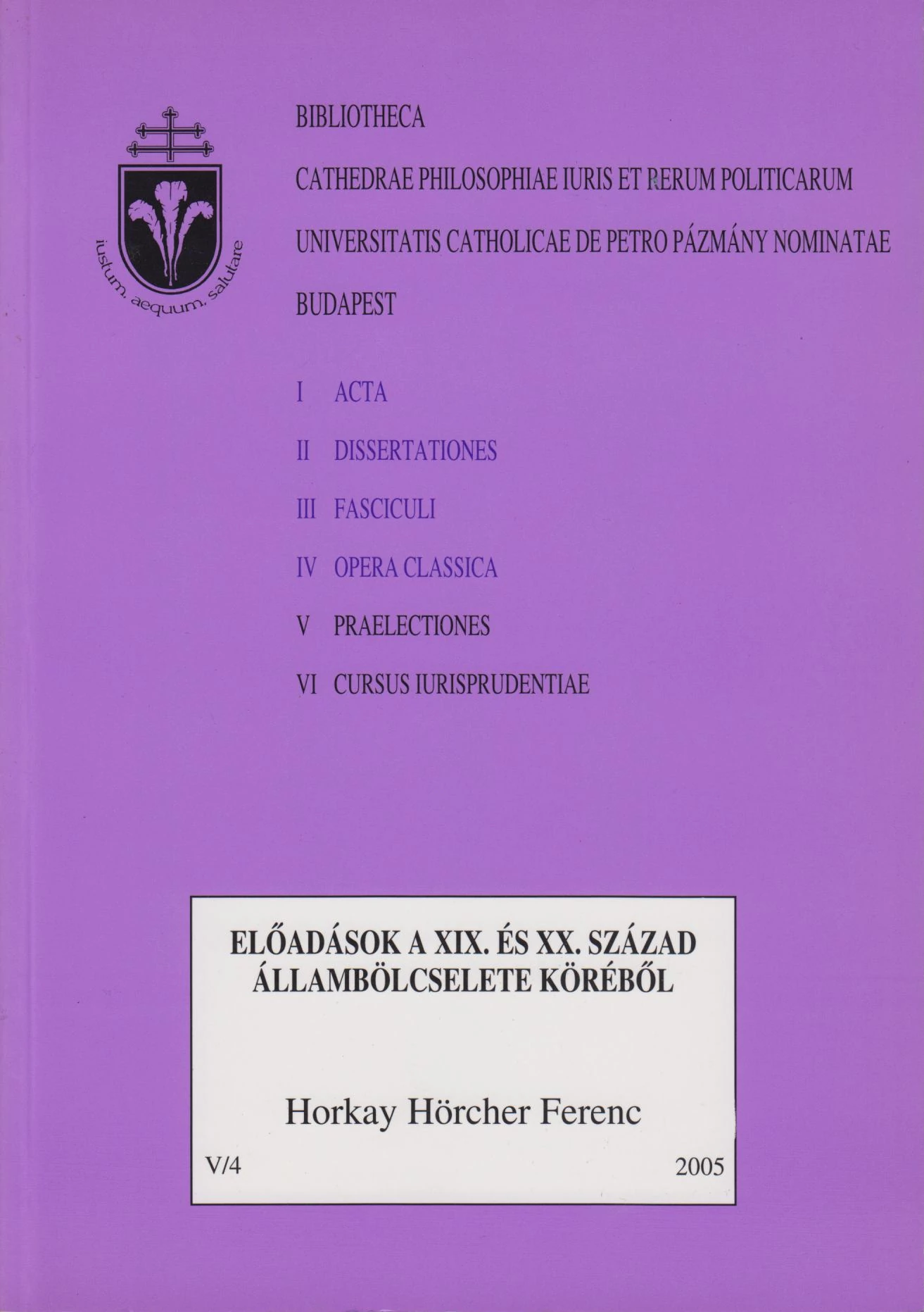 Ezek az előadások a Pázmány Péter Katolikus Egyetem Jogbölcseleti Intézetének Államtan II. című előadássorozatán hangzottak el az 1997/98-as tanév második félévében. Írott változatuk megjelentetését a tanulmányi felkészülés megkönnyítése indokolta. Az előadások írott változata nagymértékben megegyezik a szóban előadottakkal. Arra kérem tehát a tisztelt olvasót, hogy előadásjegyzetként olvassa az alább következőket. Ezek az előadások nem feltétlen önálló kutatásra, de mindenekelőtt a szakirodalom és a források elemzésére épülnek. Ennek megfelelően eredetiségre legfeljebb e vonatkozásban tarthatnak igényt.