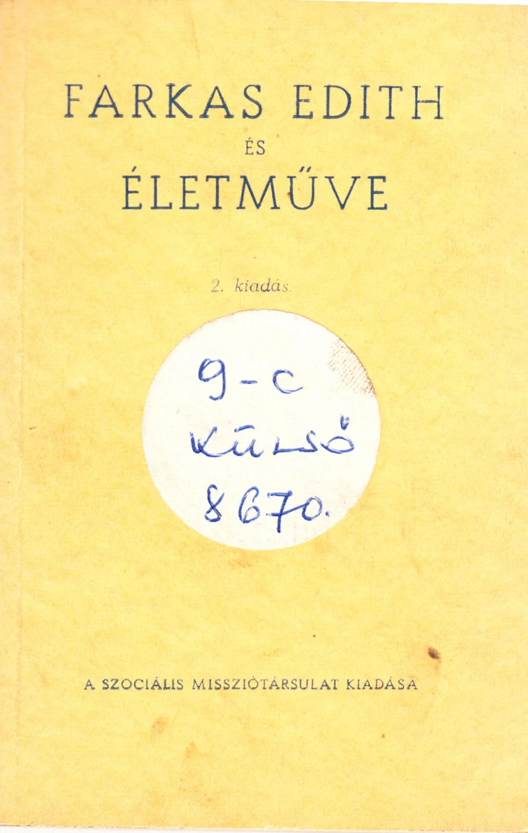 1942. április 16-án váratlanul elhunyt Farkas Edith, a Szociális Missziótársulat Alapítója és Általános Főnöknője, a magyar szociális nőmozgalom elindítója és nagy apostola. Az ő életének és irodalmi hagyatékának állít emléket a szerző. Új állapotú könyv néhány fekete-fehér fotóval. A borítóján könyvtári matrica található.