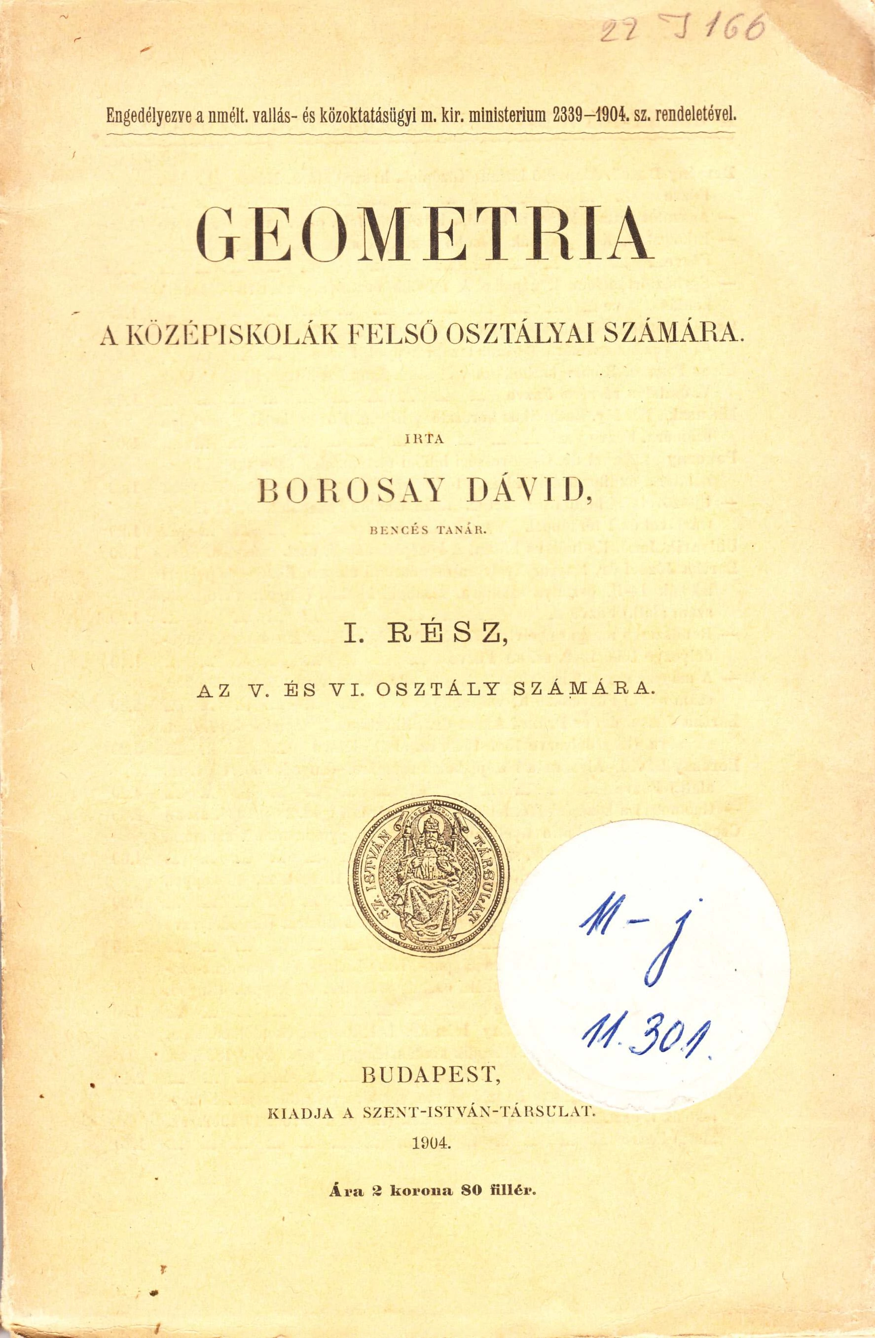 I. rész, az V. és VI. osztály számára, geometriai ábrákkal. Jó állapotú könyv papírkötésben, vágatlan lapokkal. A borítón könyvtári matrica található.
