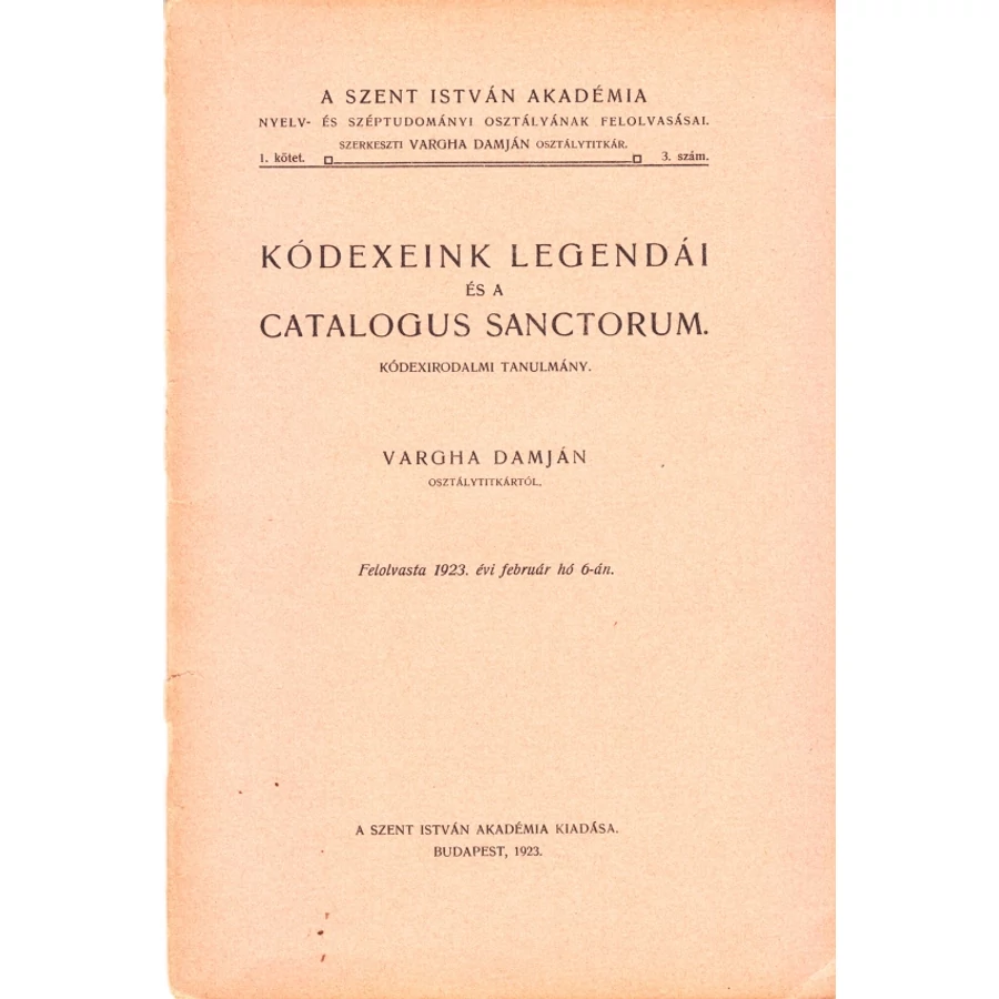 Irodalomtörténeti tanulmány Vargha Damjántól, a Szent István Akadémia Nyelv- és Széptudományi Osztályának osztálytitkárától. Felovasta: 1923. évi február hó 6-án. Kiadói papírkötésben. Jó állapotú antikvár könyv. Ritka!
